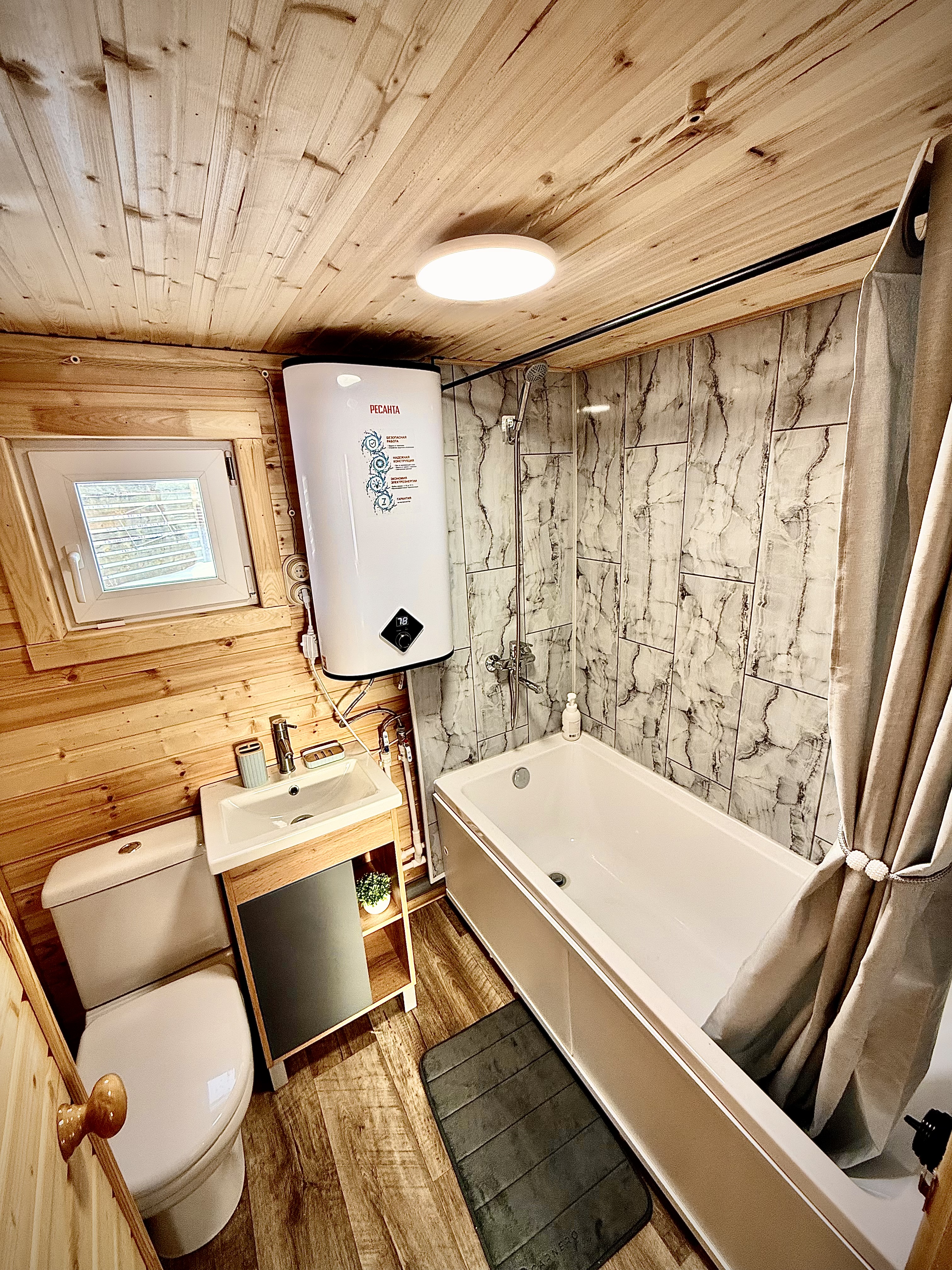 В каждом доме есть ванная комната с душем, туалетом и умывальником.